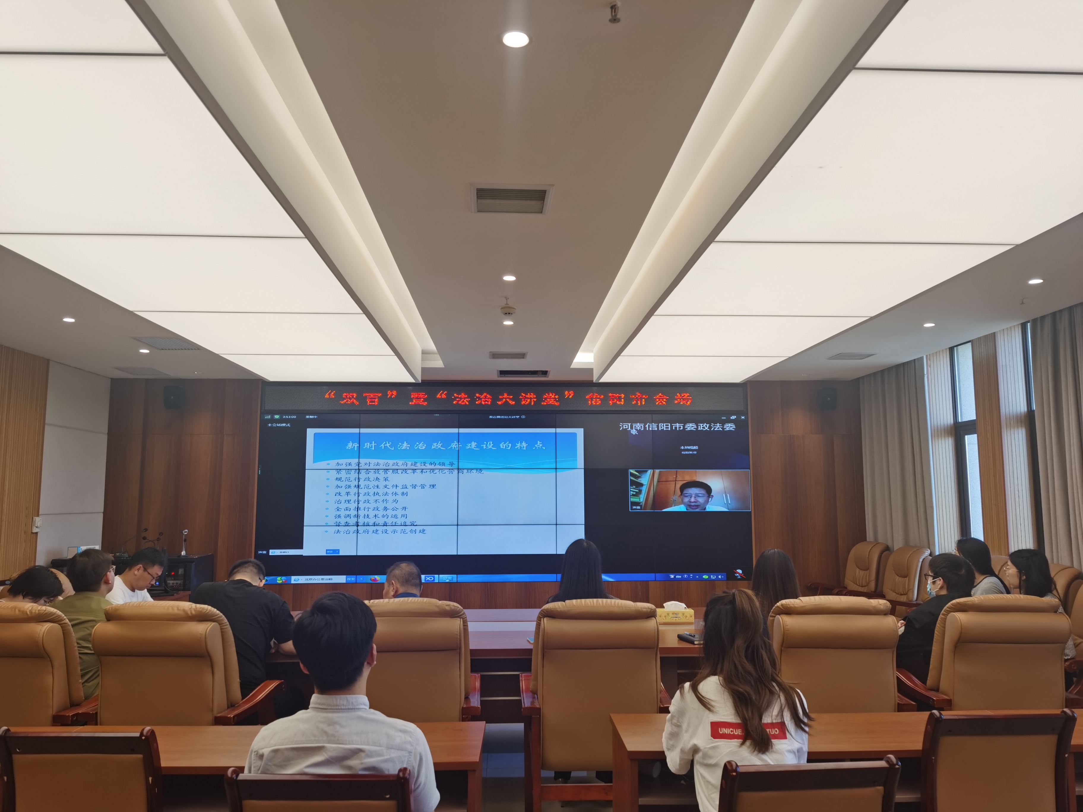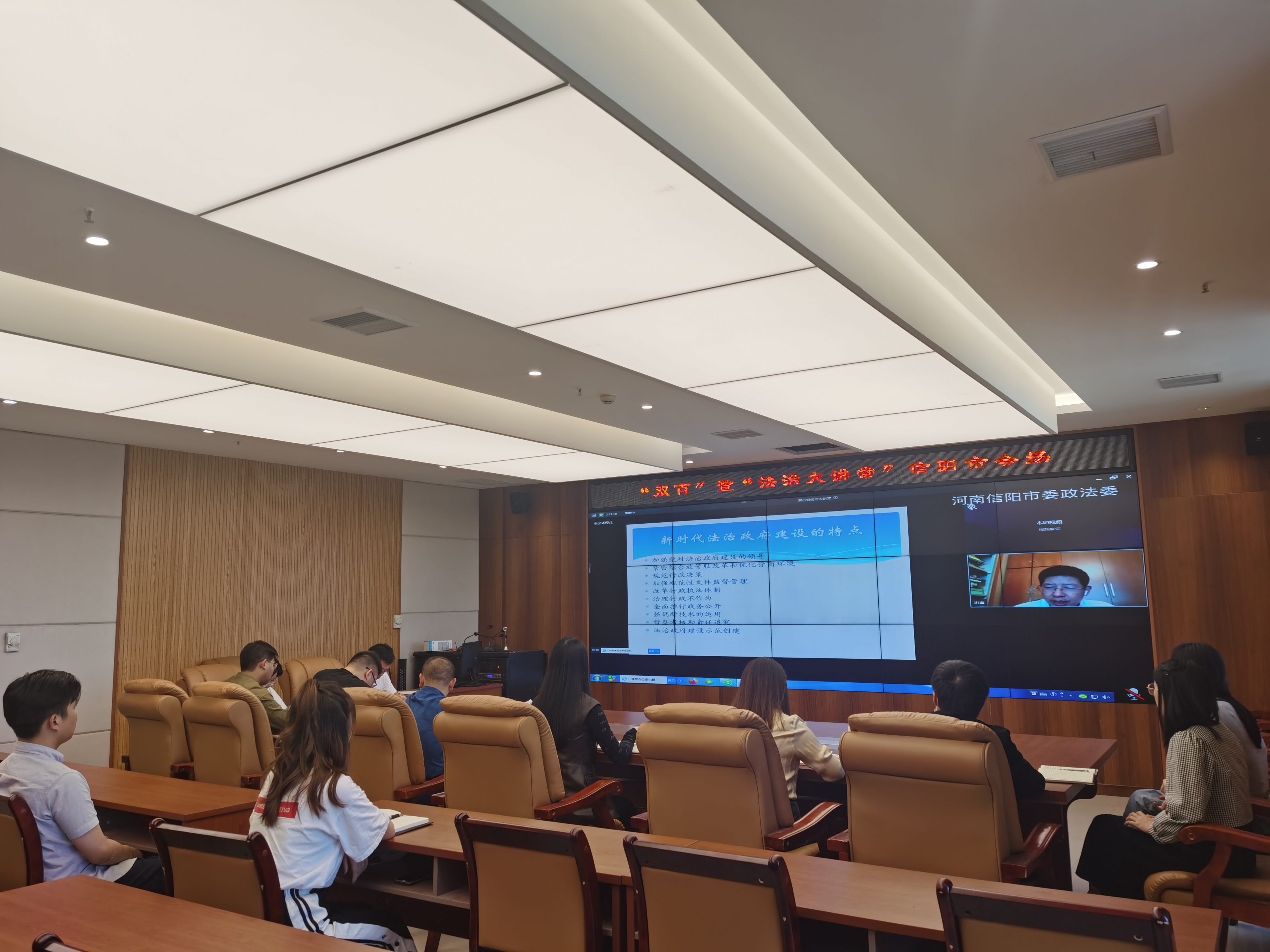 根據(jù)“百名法學(xué)家百場報告會”法治宣講活動安排,9月29日下午,信陽市法學(xué)會組織參加省法學(xué)會“雙百”暨“法治大講堂”線上宣講活動。會議采取視頻會議的形式進行,設(shè)立信陽市法學(xué)會分會場,市委政法委、市政府及市法學(xué)會有關(guān)負責(zé)同志參加了會議。