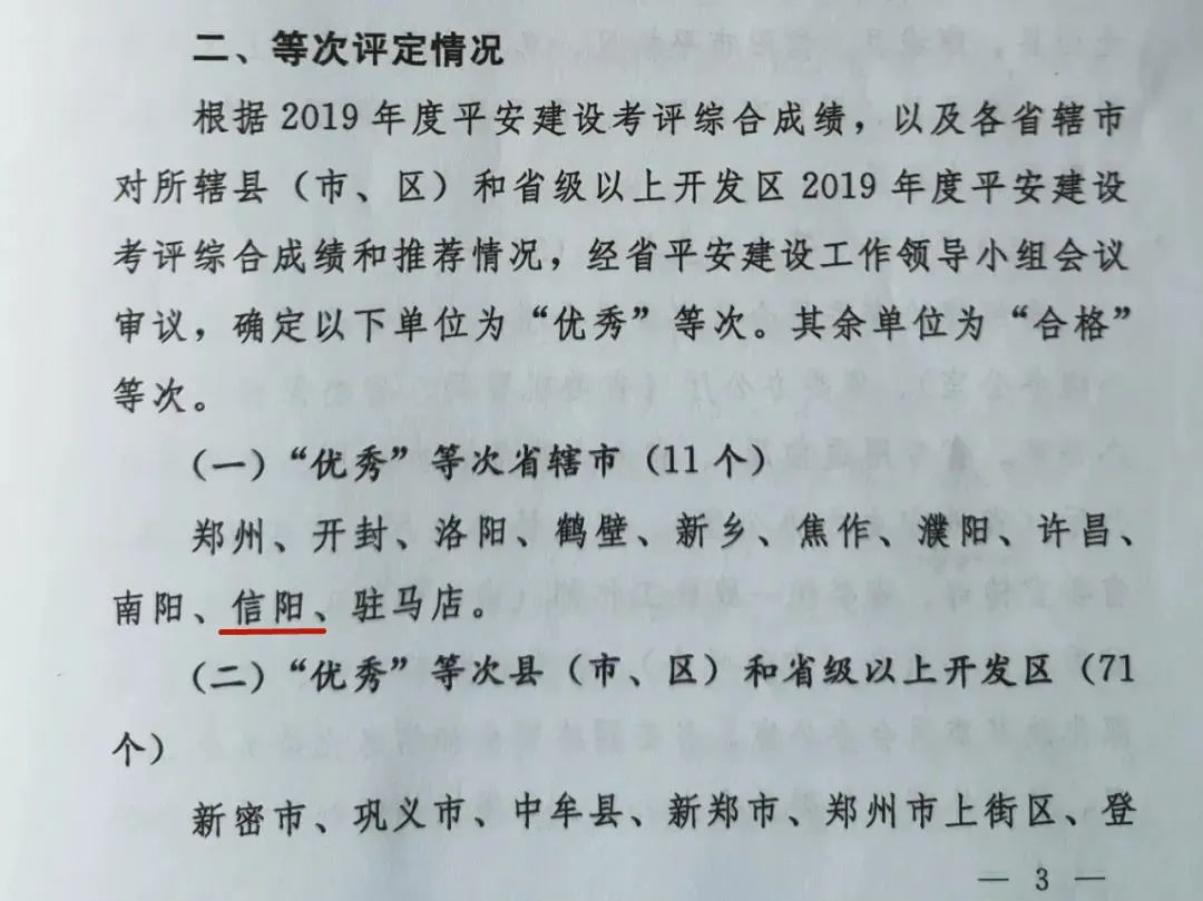 近期,省平安建設(shè)工作領(lǐng)導(dǎo)小組印發(fā)《關(guān)于2019年度全省平安建設(shè)考評情況的通報(bào)》,其中信陽市獲評“2019年度全省平安建設(shè)優(yōu)秀省轄市”。這是我市首次獲得這一榮譽(yù)。光山縣、商城縣、平橋區(qū)、息縣被評為2019年度全省平安建設(shè)“優(yōu)秀縣區(qū)”。