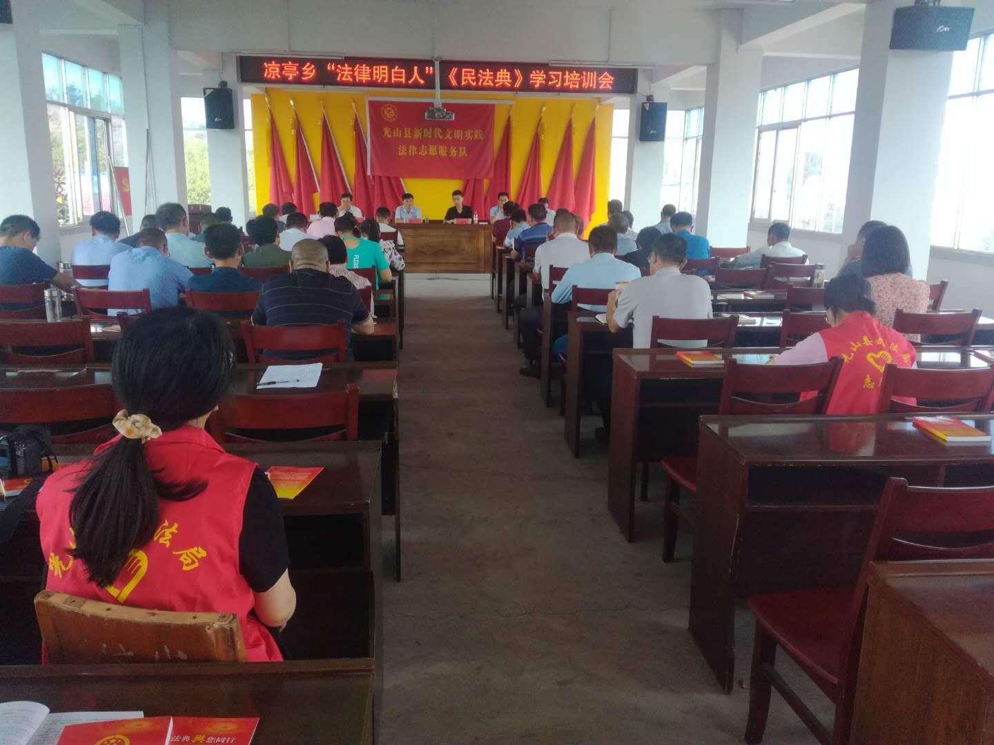 2020年9月12日下午,信陽市光山縣法學(xué)會工作站組織法律志愿服務(wù)隊人員到?jīng)鐾むl(xiāng)開展《民法典》培訓(xùn),由法學(xué)會律師會員對各村法律明白人進(jìn)行《民法典》知識授課。授課律師通過自身辦理特色突出的農(nóng)村實際案例,以案釋法,對新頒布的民法典進(jìn)行關(guān)聯(lián)解讀,使法律明白人深化了對民法典法律知識的理解和掌握,進(jìn)一步提高了鄉(xiāng)村干部法律素質(zhì)和依法辦事水平,間接性的提高了群眾依法維護(hù)自己合法權(quán)益的可靠性。培訓(xùn)會同時要求,各村法律明白人要在群眾中及時、適時宣傳法律知識,為涼亭鄉(xiāng)的法治鄉(xiāng)村建設(shè)起到很大的促進(jìn)作用。