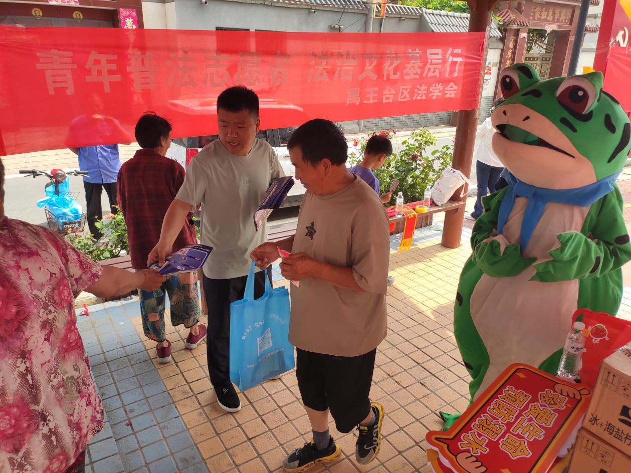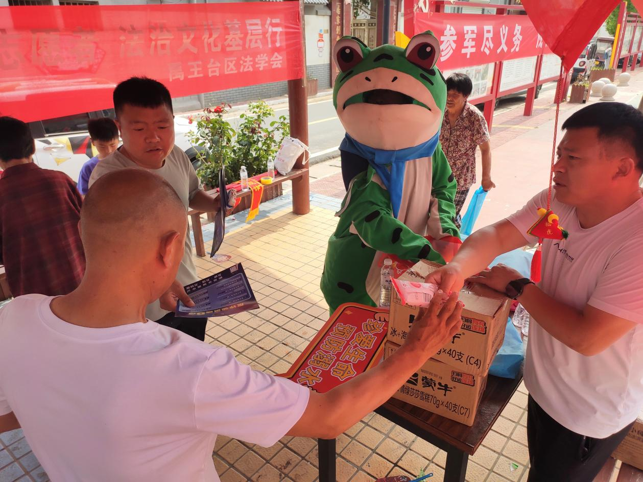禹王臺區(qū)法學(xué)會南郊鄉(xiāng)工作站創(chuàng)新普法形式,延伸普法觸角,通過“群眾喜歡、年輕人愛看”的方式“靶向施策”,加強(qiáng)“點(diǎn)對點(diǎn)、面對面”的宣傳服務(wù)。以年輕人及兒童在短視頻中喜聞樂見的“網(wǎng)紅青蛙”形象,為群眾送上一道豐盛的“法治大餐”。6月21日,南郊鄉(xiāng)工作站普法小蛙正式上線,在蘆花崗社區(qū)向群眾發(fā)放了平安建設(shè)宣傳彩頁,防溺水、國家安全、掃黑除惡、反邪教、禁毒等宣傳冊,以及雪糕、手提袋和扇子等宣傳品。