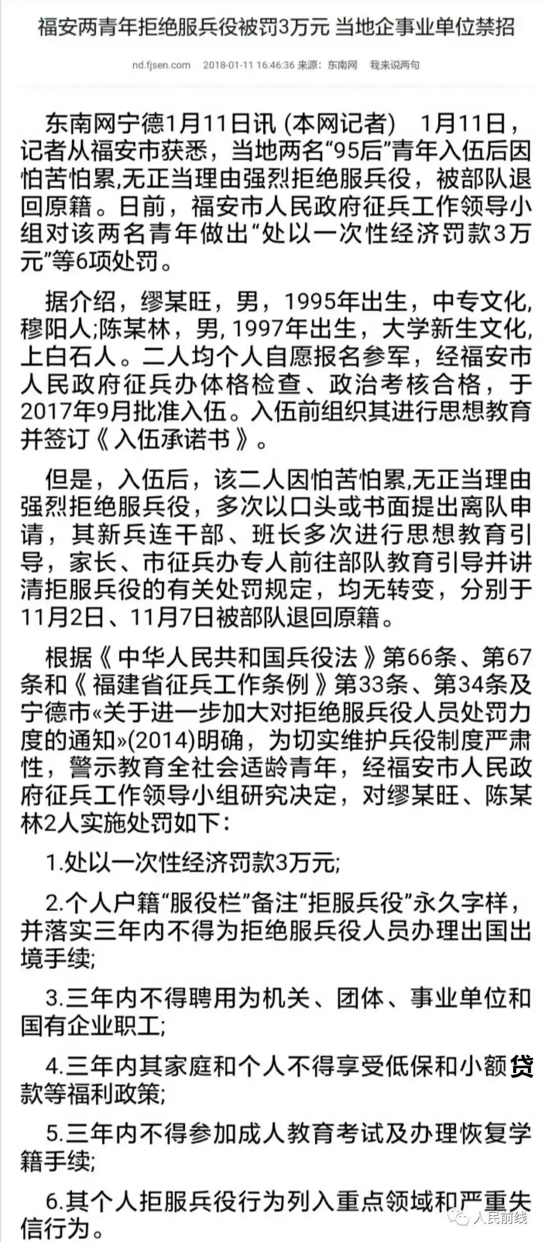 2014年7月,江蘇丹陽青年陳某入伍后怕苦畏難拒服兵役,被罰款8萬元,取消其家屬軍屬待遇,收繳全部優(yōu)待金;不得復學;兩年內(nèi)不得錄用為公務(wù)員、國企職工及不得出國。