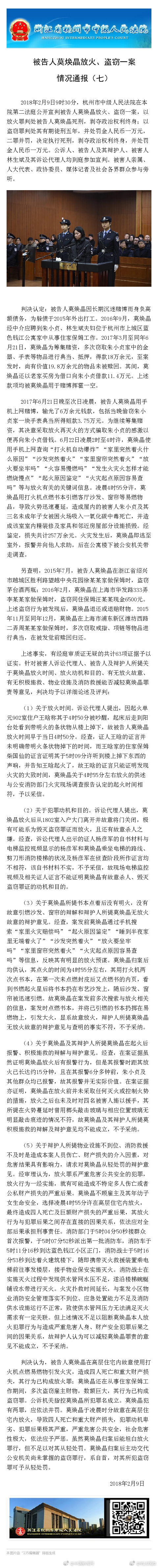 新華網(wǎng)北京2月9日電(記者 盧俊宇)據(jù)杭州市中級(jí)人民法院官方微博消息,今天上午9點(diǎn)30分,杭州市中級(jí)人民法院在第二法庭公開(kāi)宣判被告人莫煥晶放火、盜竊一案,以放火罪判處被告人莫煥晶死刑,剝奪政治權(quán)利終身;以盜竊罪判處其有期徒刑五年,并處罰金人民幣一萬(wàn)元,二罪并罰,決定執(zhí)行死刑,剝奪政治權(quán)利終身,并處罰金人民幣一萬(wàn)元。