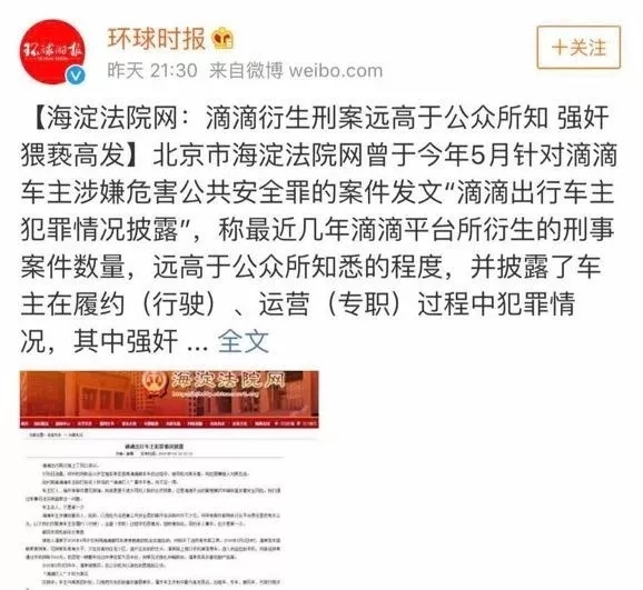 2014-2018年北京范圍內(nèi),可查滴滴車(chē)主在完成訂單過(guò)程中犯強(qiáng)奸罪2起、犯強(qiáng)制猥褻婦女罪2起(涉順風(fēng)車(chē)3起、快車(chē)1起);作為對(duì)比,出租車(chē)涉強(qiáng)奸罪2起,黑車(chē)涉強(qiáng)奸罪1起。同時(shí)考,慮到黑車(chē)中犯罪黑數(shù)相對(duì)較高(被害人不報(bào)案)、破案難度更大,目前從有限數(shù)據(jù)上,不能認(rèn)為滴滴推高了犯罪發(fā)生率。