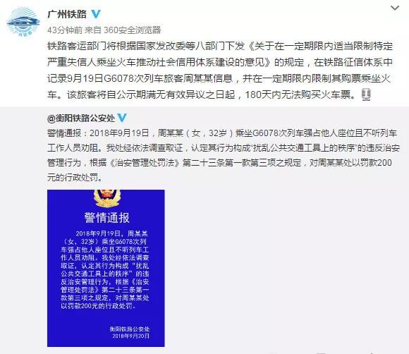 鐵路客運部門將根據(jù)國家發(fā)改委等八部門下發(fā)《關于在一定期限內(nèi)適當限制特定嚴重失信人乘坐火車推動社會信用體系建設的意見》的規(guī)定,在鐵路征信體系中記錄9月19日G6078次列車旅客周某某信息,并在一定期限內(nèi)限制其購票乘坐火車。該旅客將自公示期滿無有效異議之日起,180天內(nèi)無法購買火車票。