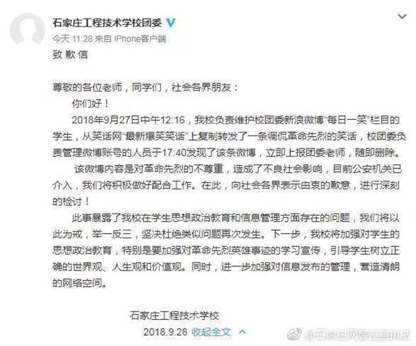 9月28日下午,石家莊市公安局網(wǎng)絡(luò)安全保衛(wèi)支隊法人微博 石家莊網(wǎng)警巡查執(zhí)法發(fā)布通報,通報稱:9月27日下午,一條由經(jīng)過認(rèn)證的官方微博 石家莊工程技術(shù)學(xué)校團委發(fā)出的惡搞三位英雄烈士的微博,引起了網(wǎng)民的廣泛關(guān)注和強烈憤慨。石家莊網(wǎng)警在發(fā)現(xiàn)上述涉嫌惡搞英烈的違法信息后,隨即依法展開調(diào)查。經(jīng)連夜工作,最終鎖定了涉嫌發(fā)布該微博信息的違法嫌疑人。同時將該信息通報給了相關(guān)管理部門,我們注意到9月28日上午11點28分, 石家莊工程技術(shù)學(xué)校團委的微博已經(jīng)就此事件發(fā)布了致歉信。