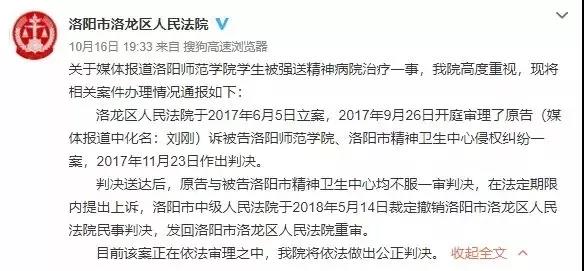 洛陽市洛龍區(qū)人民法院10月16日消息,關(guān)于媒體報(bào)道洛陽師范學(xué)院學(xué)生被強(qiáng)送精神病院治療一事,我院高度重視,現(xiàn)將相關(guān)案件辦理情況通報(bào)如下: