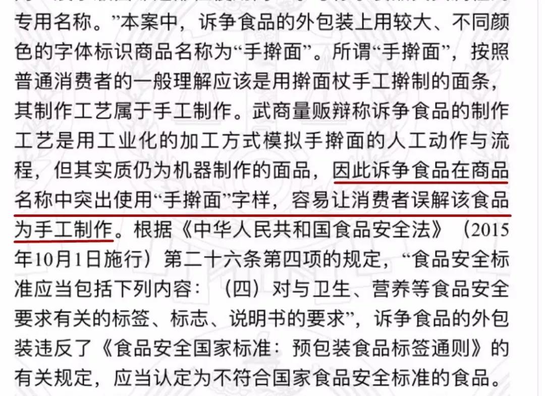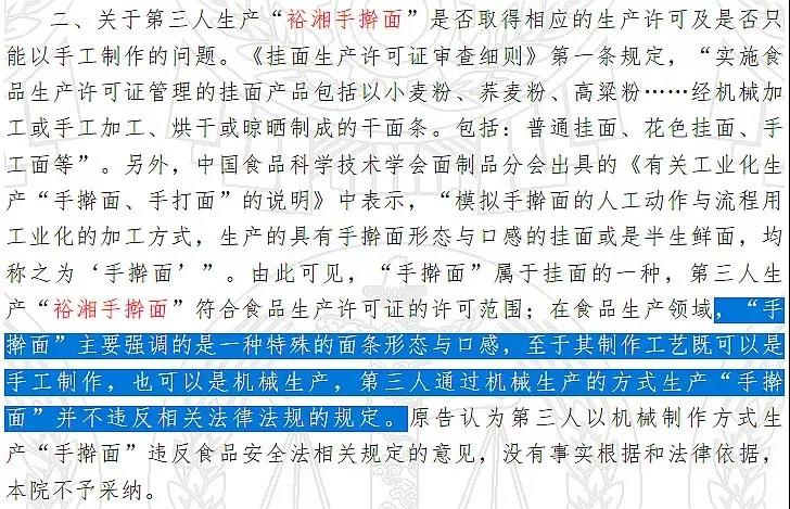 原告敗訴的判決中,兩次出現(xiàn)了中國食品科學技術學會面制品分會出具的《有關工業(yè)化生產(chǎn)“手搟面、手打面”的說明》稱,“在我國,模擬手搟面的人工動作與流程用工業(yè)化的加工方式,生產(chǎn)的具有手搟面形態(tài)與口感的掛面或半生鮮面,均稱之為手搟面”。法院認為“商家此行為(外包裝標注“裕湘手搟銀絲掛面”)符合一般大眾的認知,符合社會化大生產(chǎn)的實際,涉案食品包裝不足以誤導消費者誤解其產(chǎn)品屬性,更不會影響食品安全”,并以此為由判令消費者敗訴。
