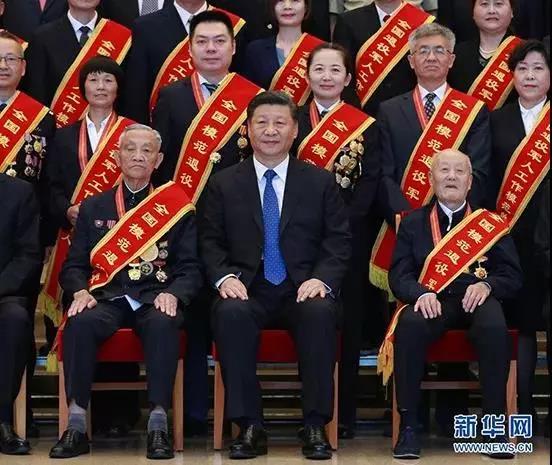 2019年7月26日,黨和國家領(lǐng)導(dǎo)人習(xí)近平、李克強(qiáng)、王滬寧等在北京會見全國退役軍人工作會議全體代表。在習(xí)近平總書記身旁的分別是張富清(右)和朱再保(左)。